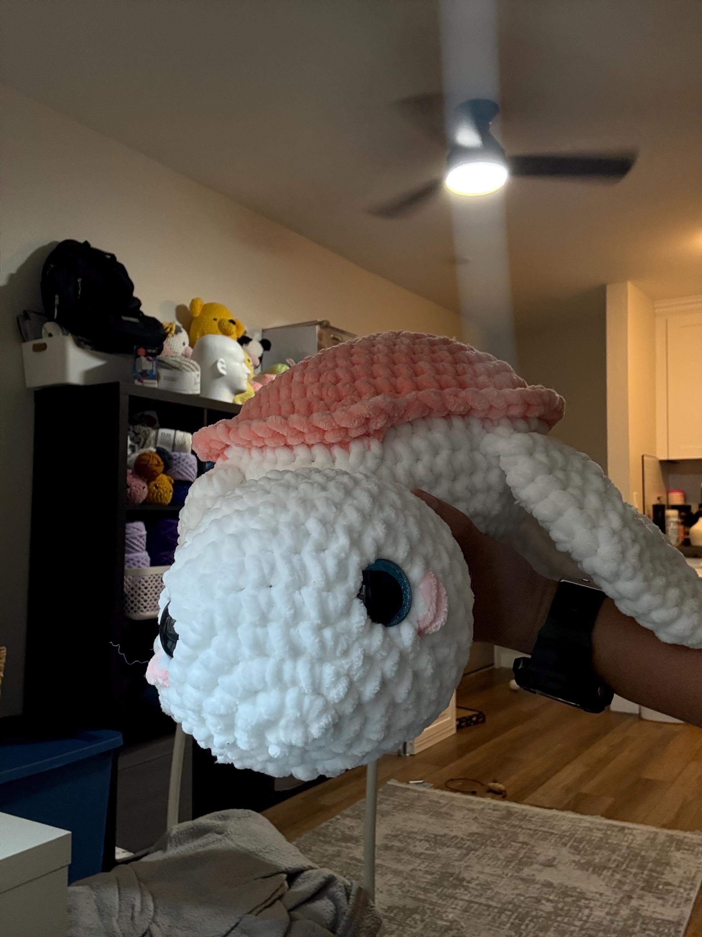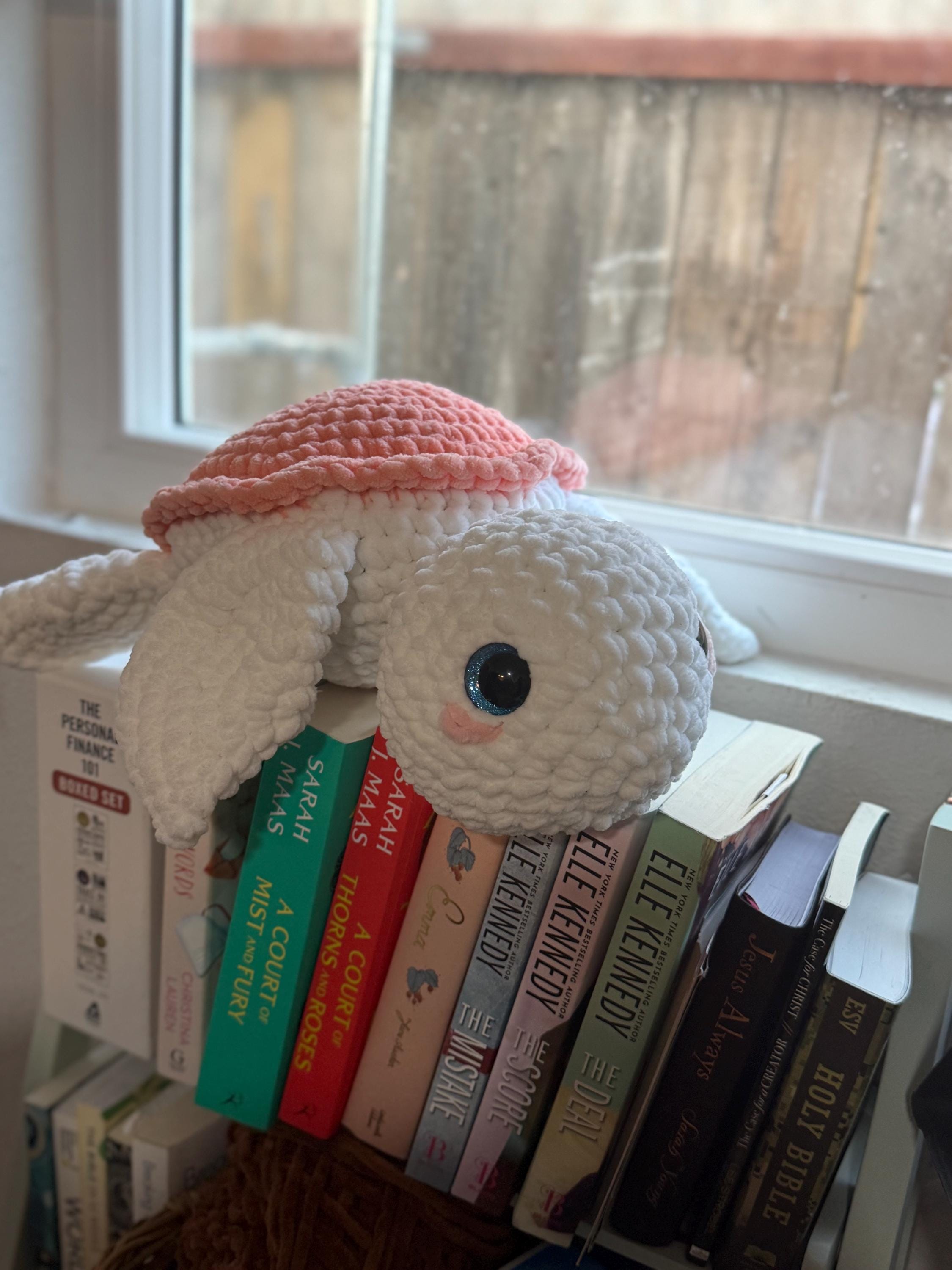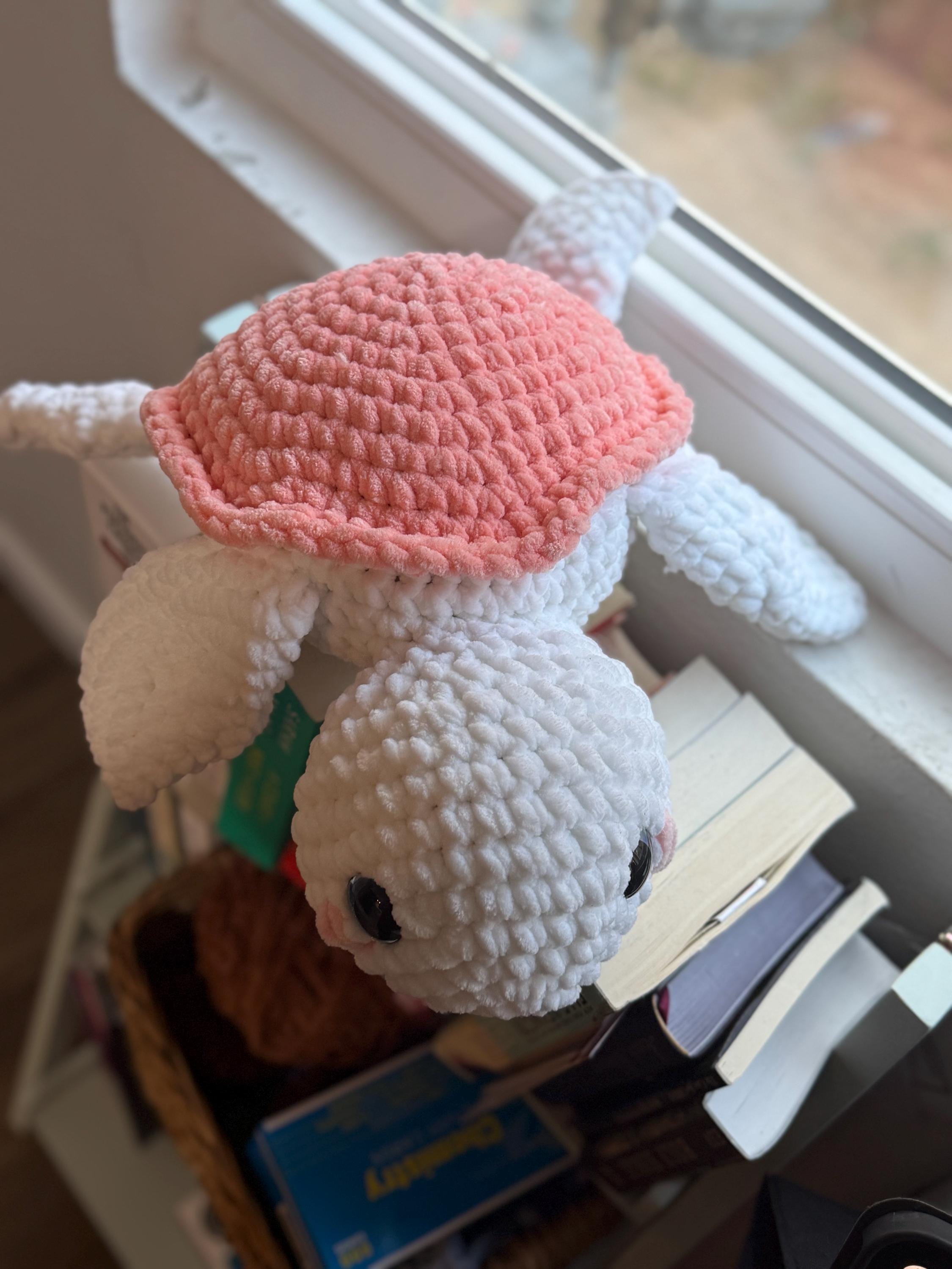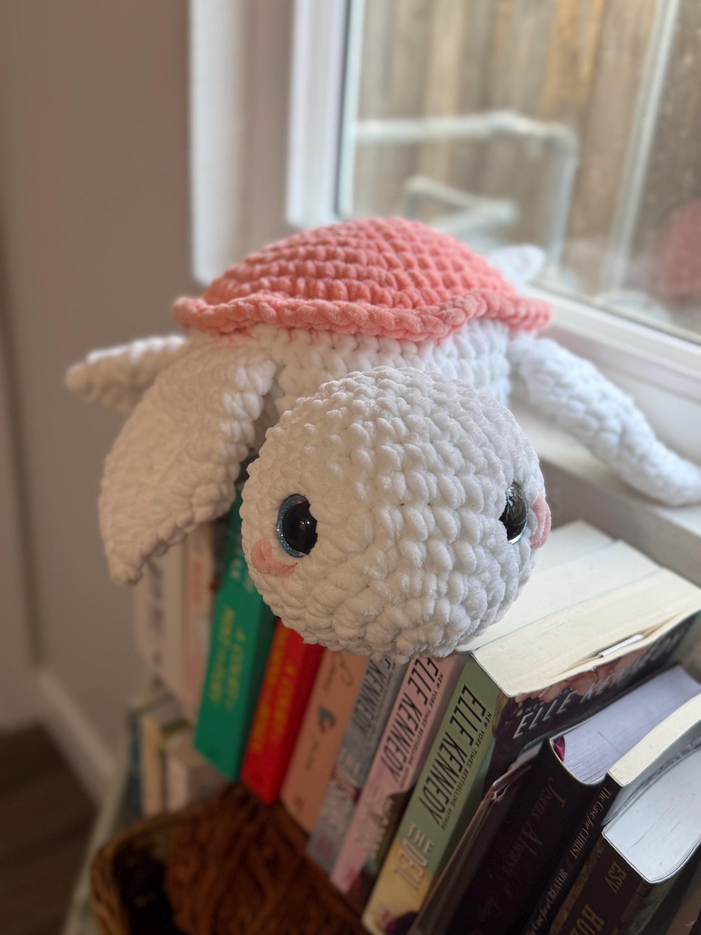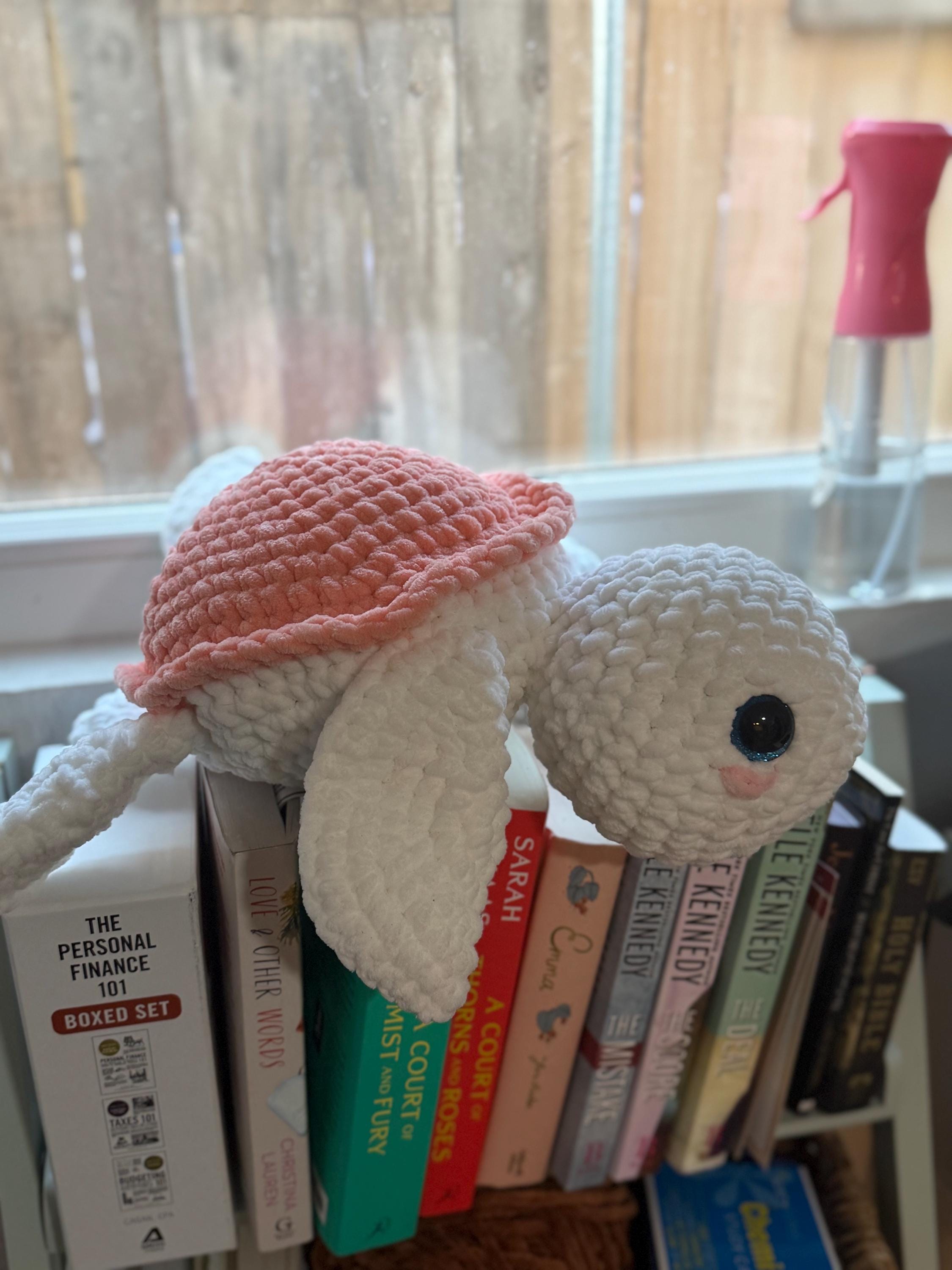 This soft and squishy turtle plushie is lovingly handmade with ultra-plush velvet yarn, featuring a white textured body and warm peach-colored shell. With big glossy safety eyes and gentle blush cheeks, this sweet sea brings charm and comfort to any room.